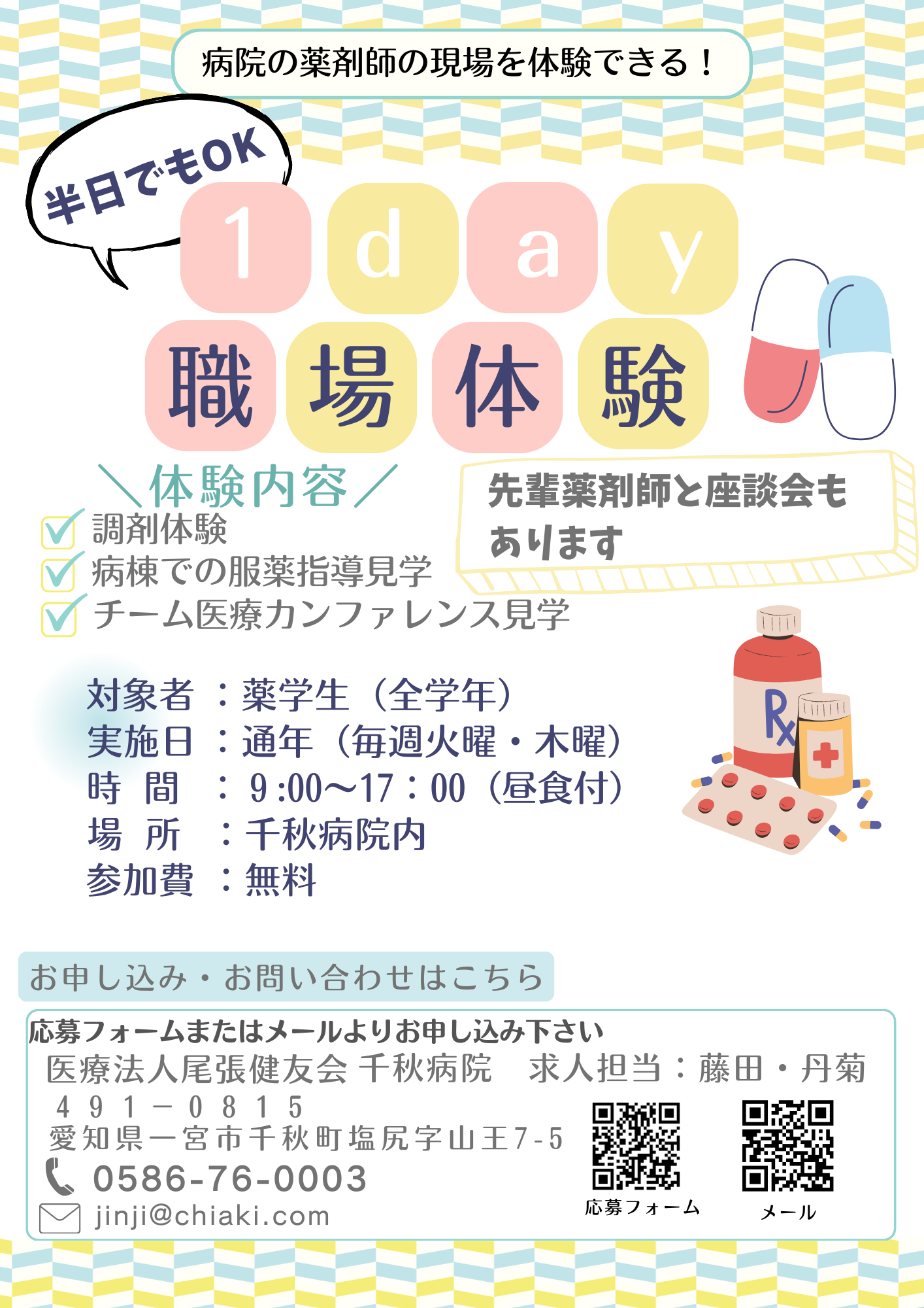 ~薬学生対象(全学年)~ 病院の薬剤師の現場を体験できる❢ ◇体験内容 *調剤体験 *病棟で服薬指導見学 *チーム医療カンファレンス見学 ◇対象者 *薬学生(全学年) ◇実施日 *通年(土日祝を除く) ※希望日をお知らせ下さい! ◇時間 *9:00~15:00(昼食付) ◇参加費:無料 お申し込みは下記のフォームよりお申し込み下さい!
